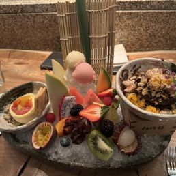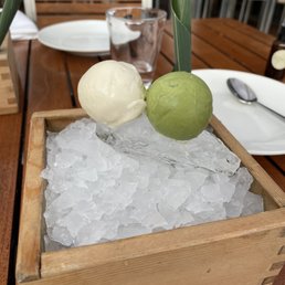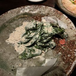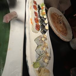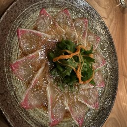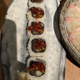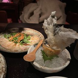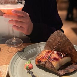 Service - we checked in for our reservation 2 mins early. We were sent downstair, so if you're a first timer make sure you reserve upstairs. Downstairs was really loud with a DJ. It was pretty with flowers on the ceiling and a cool vibe, but hard to have a conversation. The staff were all very friendly. Our table was not ready so we had to wait another 15 mins or so but the hostesses kept us posted and brought us a champagne welcome drink on the house. Food - everything was delicious. The sea bass sashimi was really delicate and had a great sauce that we kept to use with other dishes. The nigiri was all flavorful and perfectly portioned. But two dishes we got that were better than expected were the spinach salad and a dish with cooked eggplant and fish shavings. I don't have exactly names but when you see the menu make sure you get them!